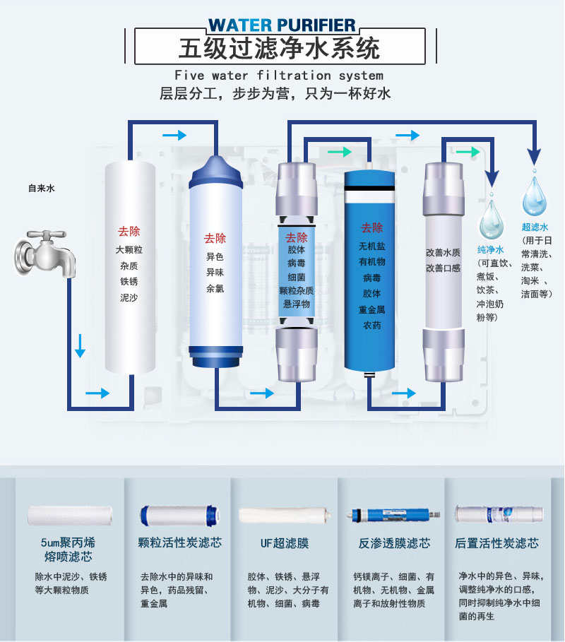 ●濾料組合:PP棉+顆粒活性碳+壓縮活性碳+RO膜+后置活性碳